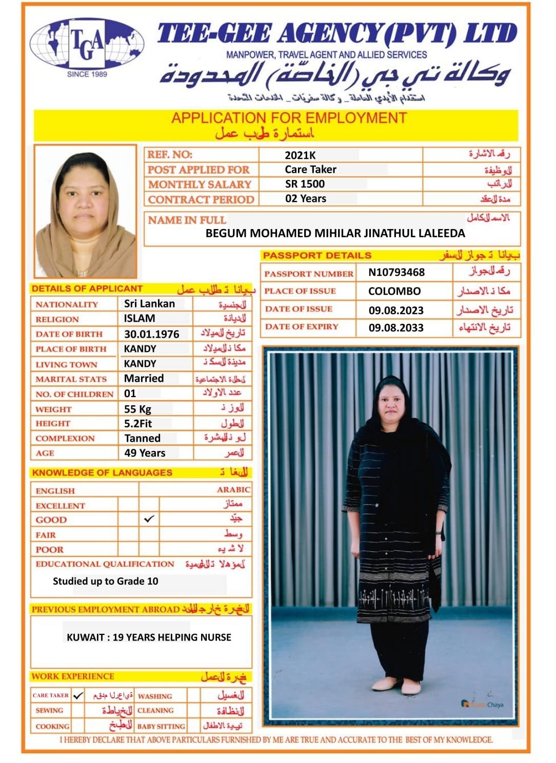 الاسم: | BEGUM MOHAMED MIHILAR JINATHUL LALEEDA |