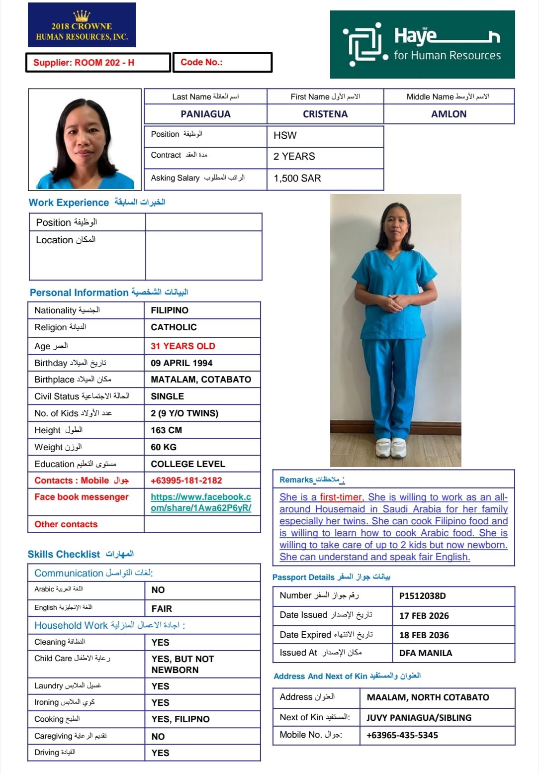 | المهنة: | عاملة منزلية |